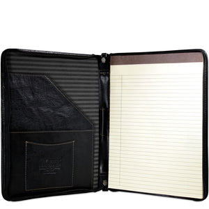 This Voyager professional letter size writing pad holder is made from hand-stained buffalo leather. It offers classic style and function with a softly padded cover for a luxurious handmade feel. This executive padfolio Includes an inside document pocket, business card pocket, pen loop, and room for an 8 1/2" x 11" letter size writing pad which is included. The writing pad cover features: