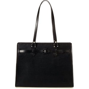 Carry your files, folders, and mobile devices to work inside this sleek leather business tote bag. The Chelsea Alexis Business Tote is handmade from saffiano cross-grain scratch & stain resistant Italian leather. Its structured design has a wide gusset for greater capacity and long flat handles that make it easy and comfortable to carry on the shoulder. This tote bag has a roomy main section with secure top zip closure and a fully lined interior that includes a pocket for laptops with up to a 14" screen, a dedicated pocket for your iPad or tablet, and organizer pockets to hold your phone, wallet, pens, and accessories. It features: