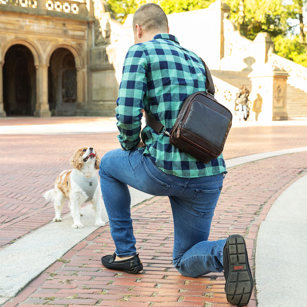 This Sling Bag is great for carrying your must-have essentials while you're on the go. Made from hand-stained buffalo leather, the leather will build a rich patina as it ages. The bag offers space for your mobile device, tablet, wallet, notepad, documents, charging cord, and power adapters. It features an adjustable shoulder strap that can be hooked to the right side or left side of the bag, depending on your preference. This handmade leather bag features: