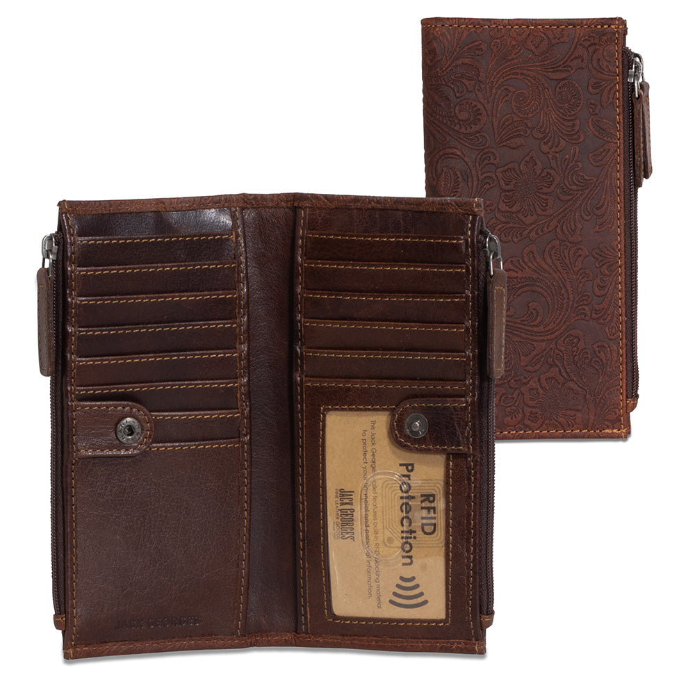 The Voyager Floral Slim Double Zip Wallet is small in size but big on function. Hand made from soft, smooth, and supple hand-stained buffalo leather, it has RFID protection, two convenient zippered compartments, an ID window, and 13 slots for credit cards, membership cards, insurance cards, etc. Large slip pockets will hold your notes and receipts. With its slim silhouette, it slides easily in and out of your favorite bag. The wallet features: