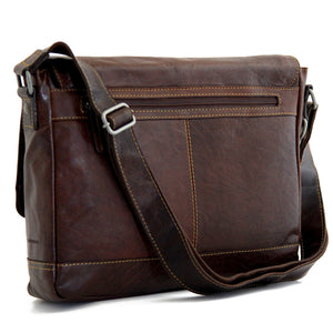 This sophisticated leather messenger bag offers style and function in a smaller package. Handmade from buffalo leather that builds a rich patina as it ages, the bag has a flap with a magnetic catch and zip closure for the main compartment for extra security. This messenger has a padded pocket to hold laptops with up to 13" screens. There is Plenty of room for files and folders along with an organizer to hold your mobile phone, portable hard drive, pens, and your accessories. There are also two open front pockets beneath the flap and zippered front & back pockets to hold things that you need close at hand. An adjustable shoulder strap provides carrying comfort and versatility. The bag features: